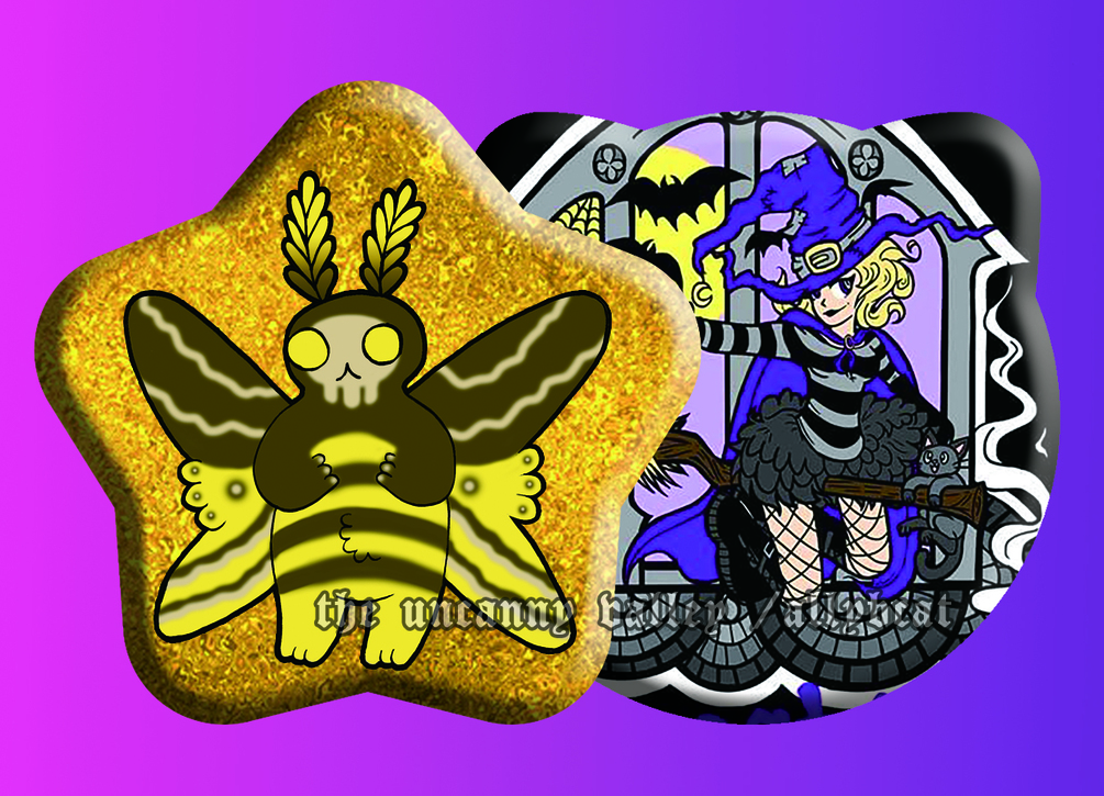 Two pinback buttons, perfect for backpacks, ITA bags, jackets and more. Cat's classic MothBaby design and some "vintage" Ally Cat artwork of a witch persona. Buttons are approx. 2.25" wide. Only five button packs will be available, and then the rest of the MothBaby buttons will be sold at local events.